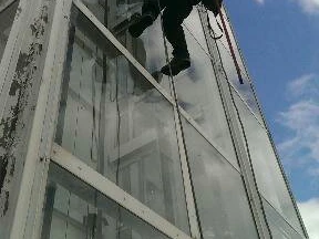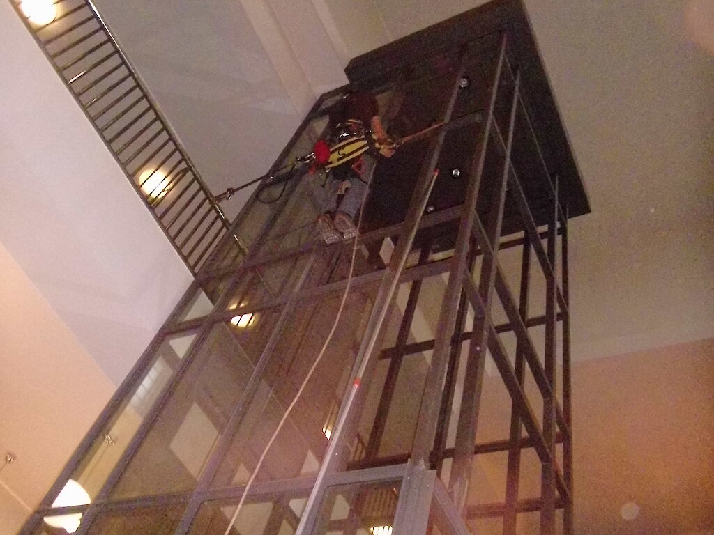 Per Seilzugangstechnik, mit erfahrenen Kletterern führen wir die Glasfahrstuhlreinigung ohne Hebebühne oder Gerüst zügig und kostensparend durch.